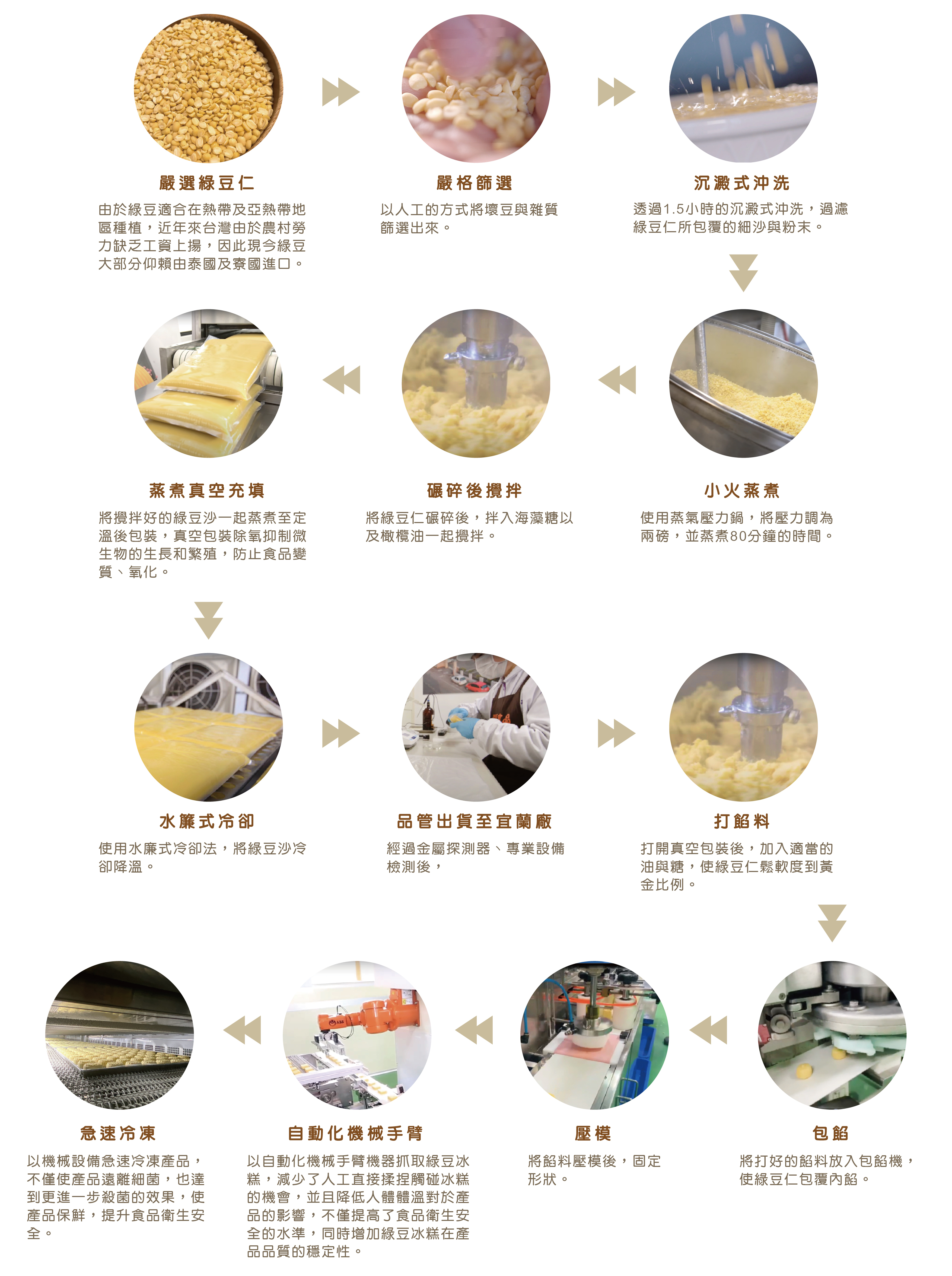 機械製作與人工最大的不同在於品質的安定。自動化機械手臂減少了人工直接揉捏觸碰冰糕的機會,並且降低人體體溫對於產品的影響,不僅提高了食品衛生安全的水準,同時增加綠豆冰糕在產品品質的穩定性。