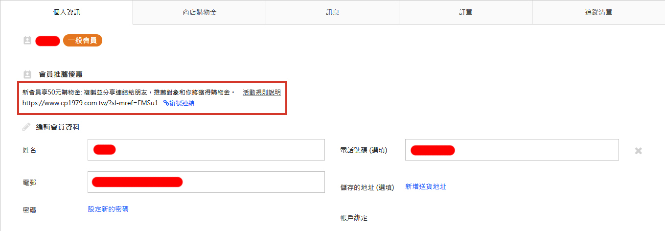 步驟一:前往商店前台「會員中心」>「個人資訊」,找到「會員推薦優惠」區塊,點擊「複製連結」,即可成功複製。
