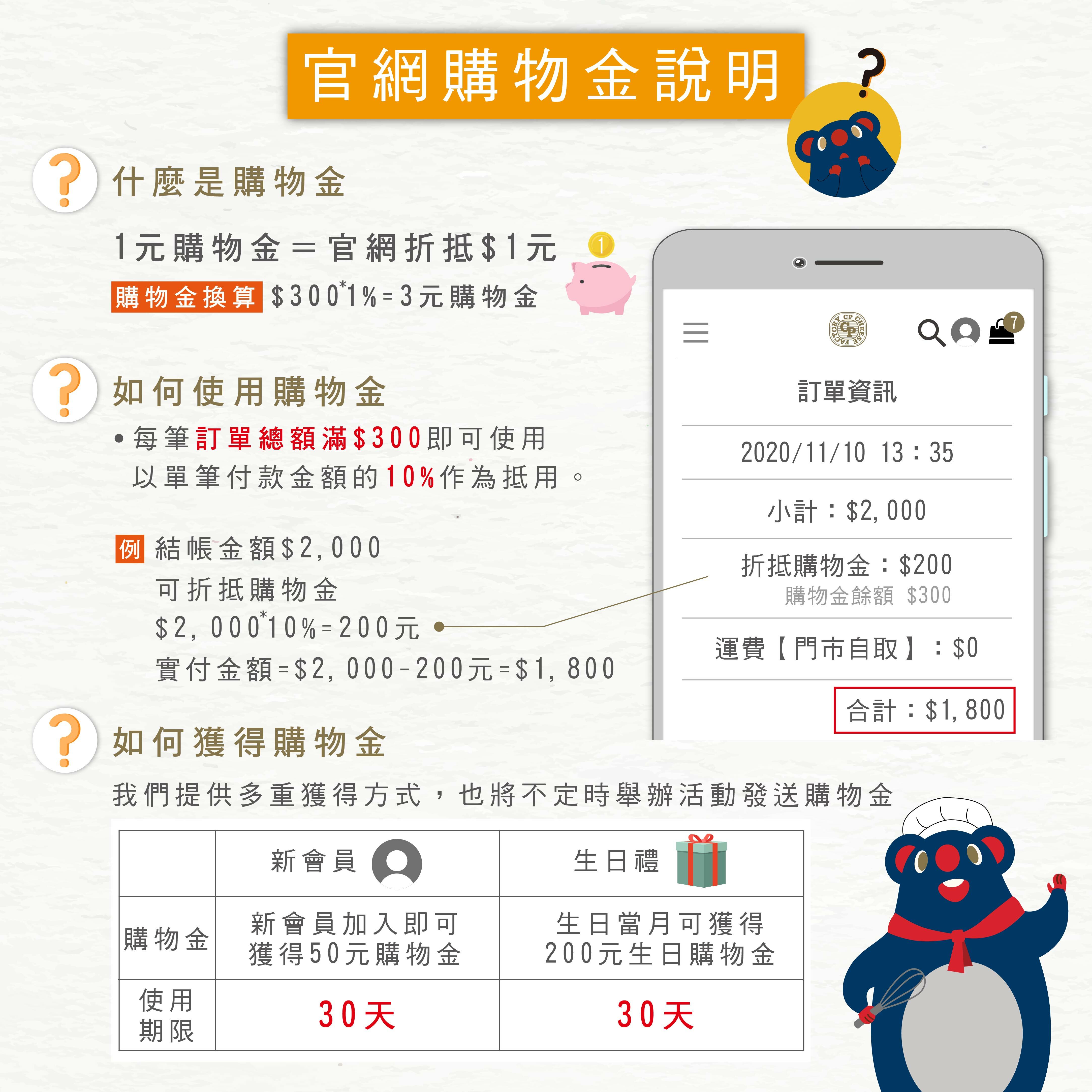 在有效期間內適用於官網消費,購物金為會員折抵消費系統計算之用,不得要求折換現金或任何等值之有價財物。