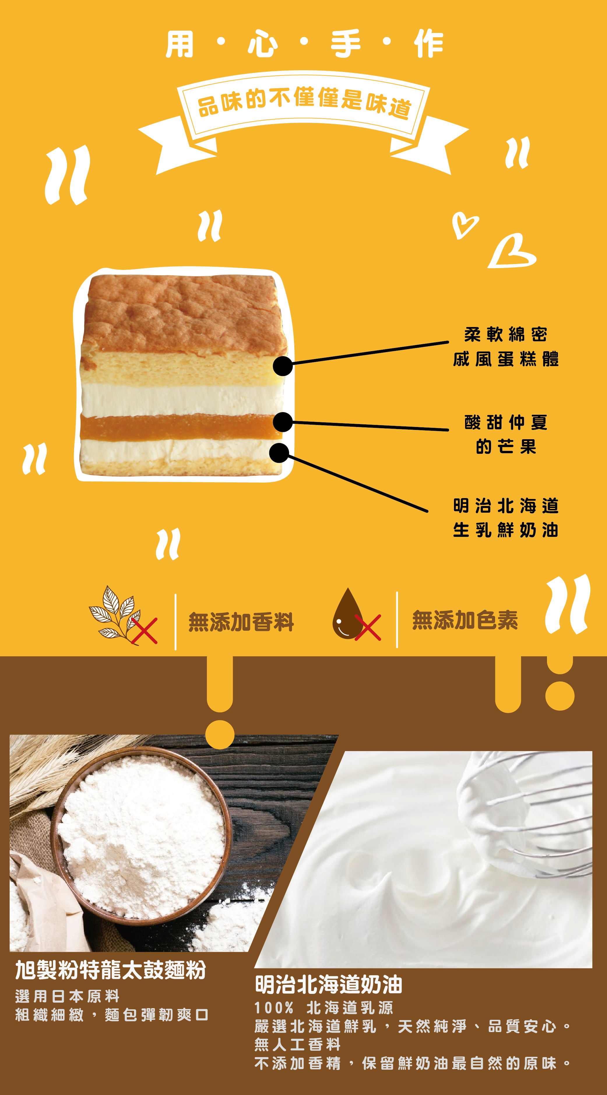 如雲朵般柔軟的蛋糕體,夾著北海道生乳奶霜與黃澄澄芒果,酸甜果香與奶香交織出夏日般的氛圍
